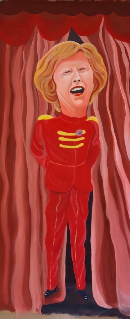 Y al revés, ¿el retrato de quién te hubiera gustado poder incluir entre esta cohorte de poderosos? ¿Es decir, cuál sería tu político deseado? Esa también es otra pregunta difícil. En fin… no es que las tuviera todas conmigo con Hilary Clinton y hubiera querido… bueno… la retraté haciéndole pasar por el aro a Trump en uno de los cuadros que era un díptico y, claro, era la desiderata frente a que no saliera aquel hombre. El caso es que la retraté de ese modo y al poco tuve que retratarle al otro como vencedor.