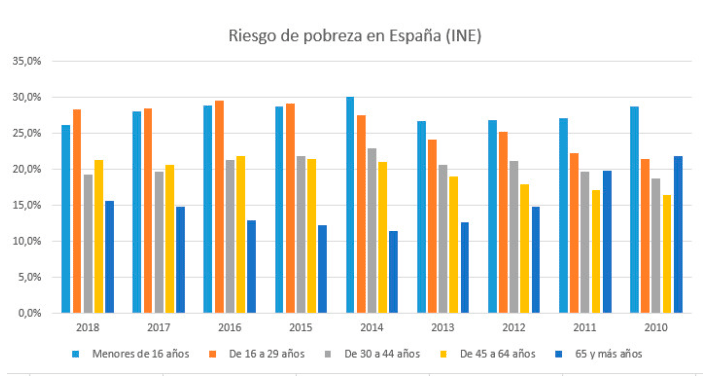 Lo cierto es que la pobreza y la exclusión social no es algo excepcional en España: según datos de 2018 del INE, una de cada cuatro personas en España se encontraba en riesgo de pobreza o exclusión social (tuvieron ingresos inferiores al 60% de la renta mediana, no pueden hacer frente a una serie de gastos considerados básicos) o en hogares con muy baja intensidad de trabajo, derivada de la parcialidad laboral o de trabajar de manera intermitente a lo largo del año. Más de diez millones de españoles viven con graves carencias. Y además, como podemos ver en el gráfico inferior, afecta mucho más a los jóvenes que al resto de franja de edades.