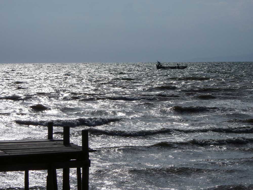 Kep se abre al golfo de Siam y es mínimo puerto donde humildes embarcaciones de pesca descargan crustáceos y pescadillos. Un cangrejo gigante de hormigón señala que allí es obligado comer las sabrosas nécoras locales. La playa colindante recibe los fines de semana una muchedumbre que se hacina en todo tipo de vehículos y cree conveniente alquilar pedazos de acera con estera y sombrilla ─gentileza del ayuntamiento que subarrienda el espacio municipal─ donde comer y desde los que harán tímidas incursiones a la arena justo para bañarse con mucho recato, las mujeres lo hacen vestidas, en unas aguas caldosas. Junto a los chiringuitos de quita y pon, bares y pequeños restaurantes proliferan en las viejas casas que asientan sus pilotes en el mar ofreciendo alimentos que sólo pueden atraer al homo occidentalis: pizzas, tacos, falafeles…