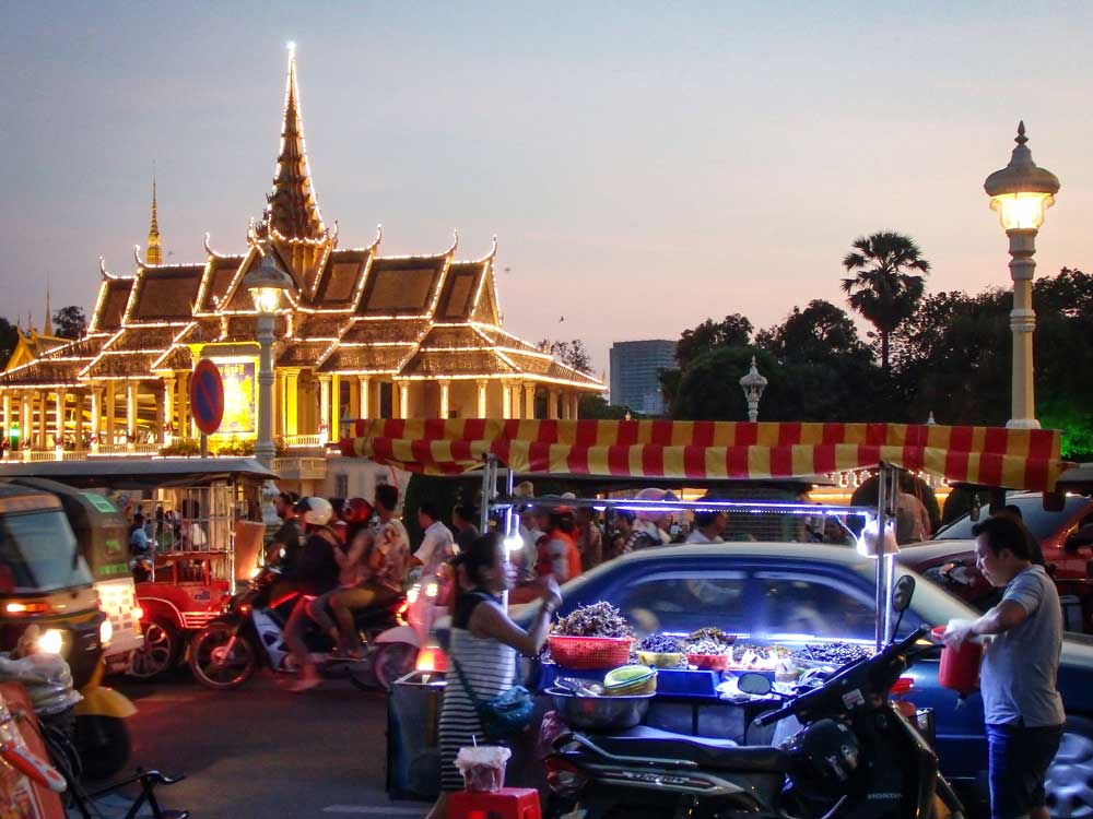 El centro neurálgico de la festividad es la colina de la señora Penh o Pnom Penh -Pnom significa altozano─, a cuya sombra creció la ciudad. Hoy la colina se asienta en un jardín y eleva en su cúspide una pagoda en la que se reza ofreciendo flores de loto, varillas de incienso y minúsculas candelas. El gentío sube y baja de continuo para, una vez cumplimentadas las ofrendas, volverse curioso o participante de los numerosos juegos populares, incluido el boxeo camboyano, o disfrutar de la música y el baile, ya sean tradicionales o adscribibles a un pop lugareño bastante sui géneris. Hasta hace poco se podía transitar alrededor de la colina a lomos de elefante. Quizá sea otro tanto que se ha anotado una modernidad que pelea contra la atmósfera del antiguo protectorado francés visible aún en la orilla del Mekong con bares y cafés frecuentados principalmente por el turismo occidental, lo que no quita para que resulte atractivo tomarse un cóctel entre muebles de ratán o bambú y bajo historiados ventiladores de techo con reflejos de latón y caoba.